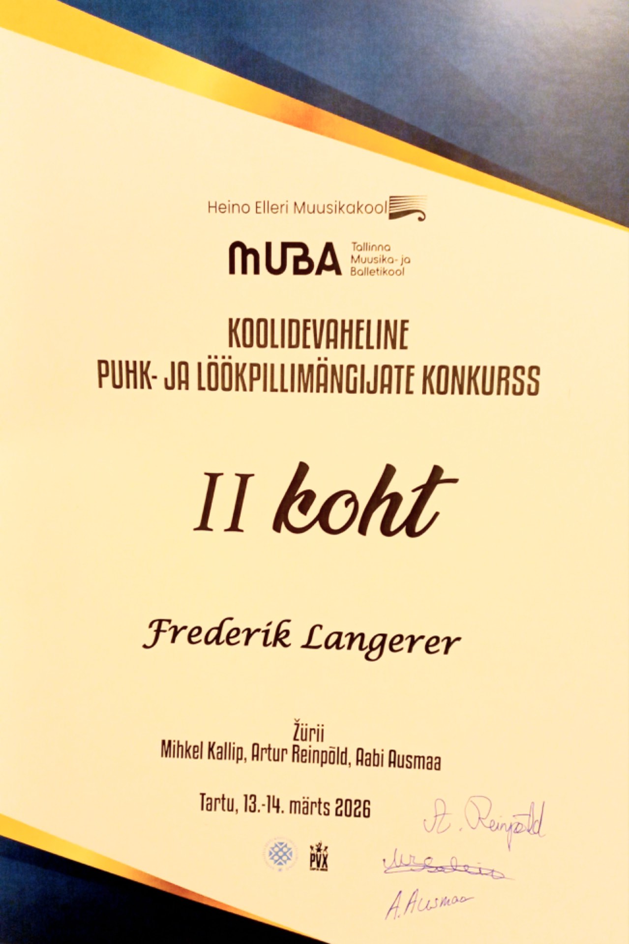 Frederik Langeler osales 13.03.2026 Tartus Heino Elleri muusikakoolis toimunud Koolidevahelisel puhk- ja löökpillide konkursil. Osalesid MUBA ja Elleri kooli õpilased, kes olid jaotatud kolme kategooriasse - puu-, vask- ja löökpillid. Igas kategoorias oli kaks vanuseastet: Nooremad (eelõpe, I - II kursus või 7.-10. klass) ja vanemad (III - IV kursus või 11.-12-klass). Frederik õpib lisaks VMK lisaastmele ja Viljandi Kesklinna Koolile ka MUBA eelastmes. Vaskpillimängijatest oli ta konkursil noorim. Etteaste õnnestus ja tasuks omistas žürii talle II koha. Trompetimängijatest oli see parim tulemus.