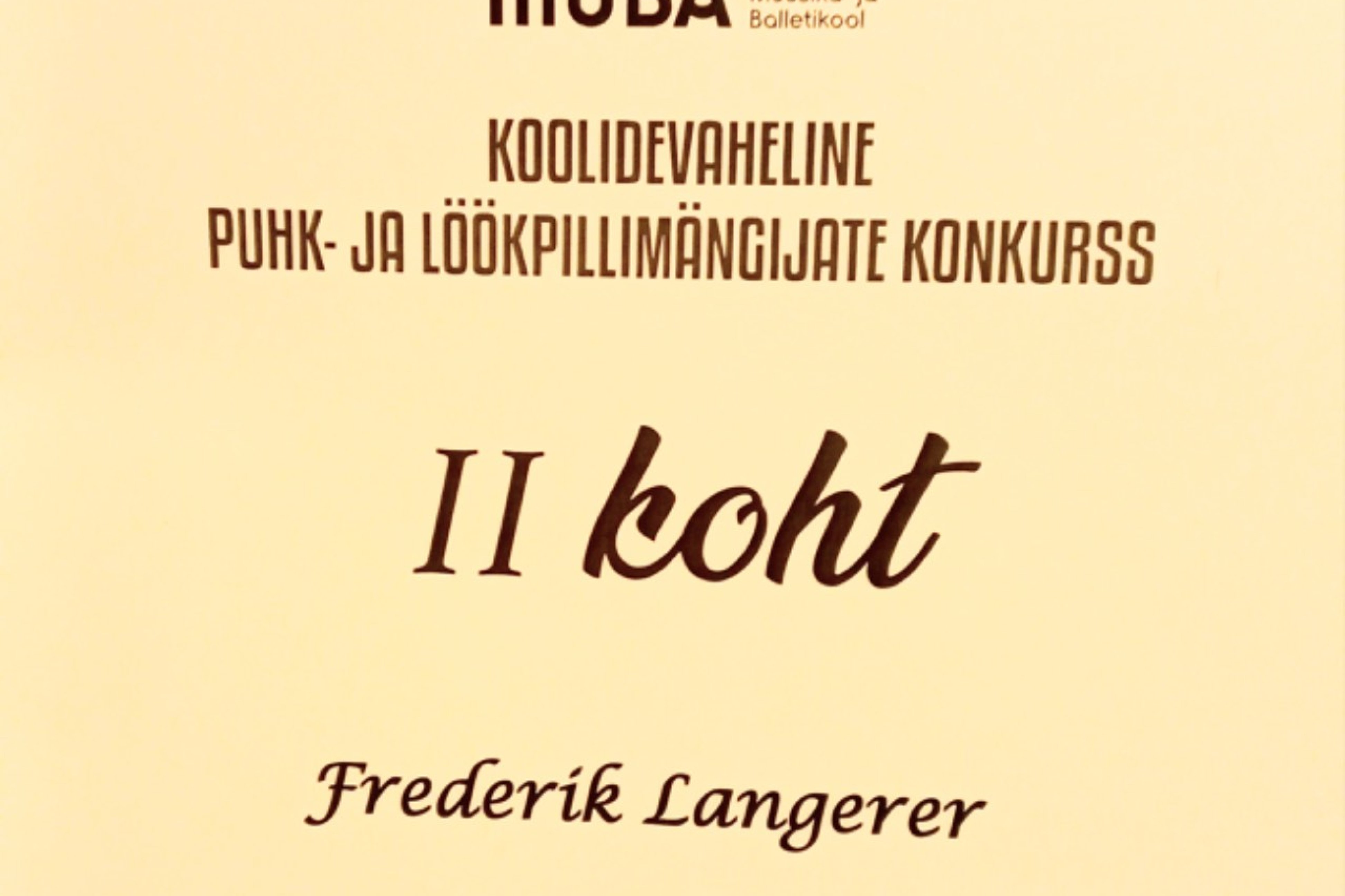 Frederik Langeler osales 13.03.2026 Tartus Heino Elleri muusikakoolis toimunud Koolidevahelisel puhk- ja löökpillide konkursil. Osalesid MUBA ja Elleri kooli õpilased, kes olid jaotatud kolme kategooriasse - puu-, vask- ja löökpillid. Igas kategoorias oli kaks vanuseastet: Nooremad (eelõpe, I - II kursus või 7.-10. klass) ja vanemad (III - IV kursus või 11.-12-klass). Frederik õpib lisaks VMK lisaastmele ja Viljandi Kesklinna Koolile ka MUBA eelastmes. Vaskpillimängijatest oli ta konkursil noorim. Etteaste õnnestus ja tasuks omistas žürii talle II koha. Trompetimängijatest oli see parim tulemus.
